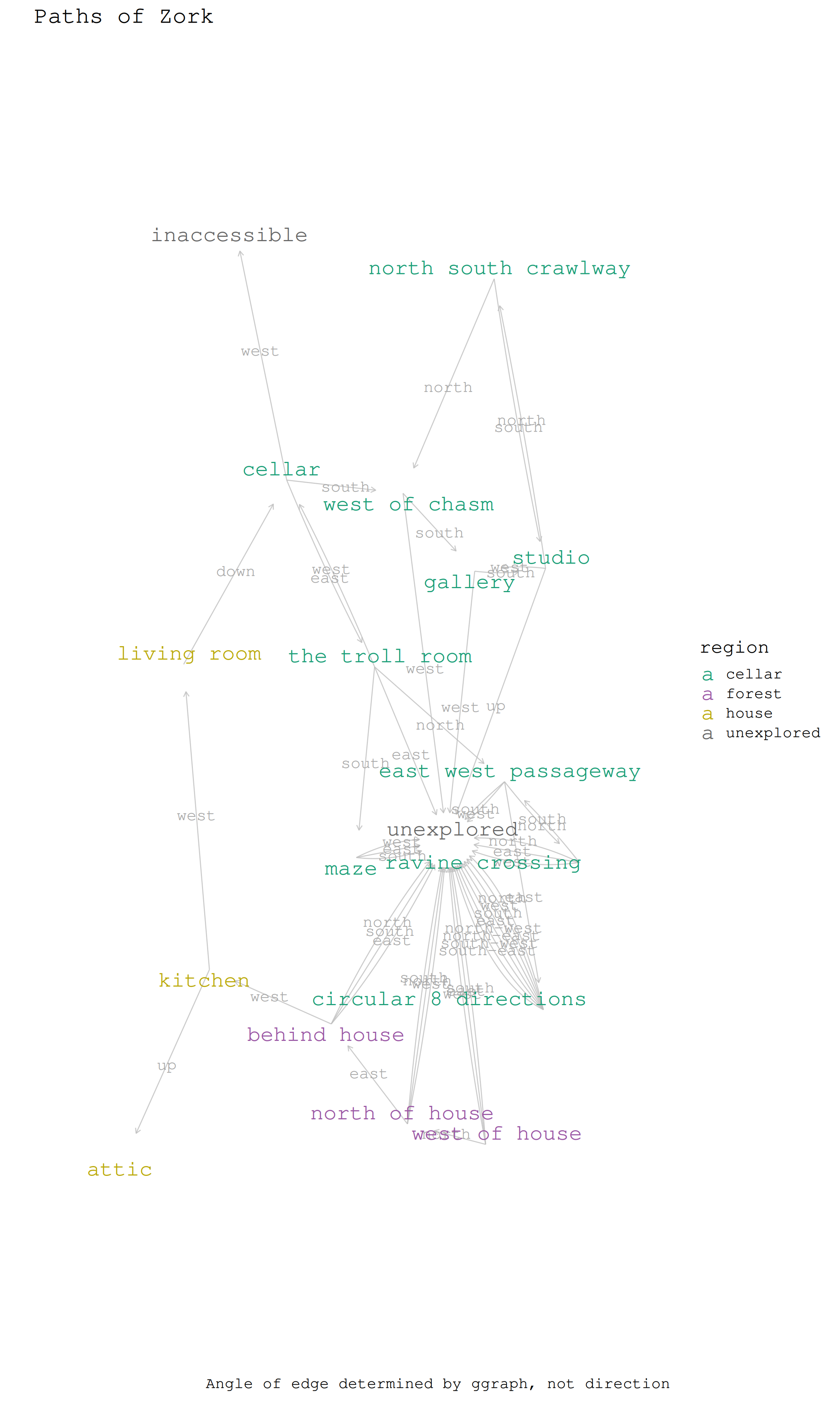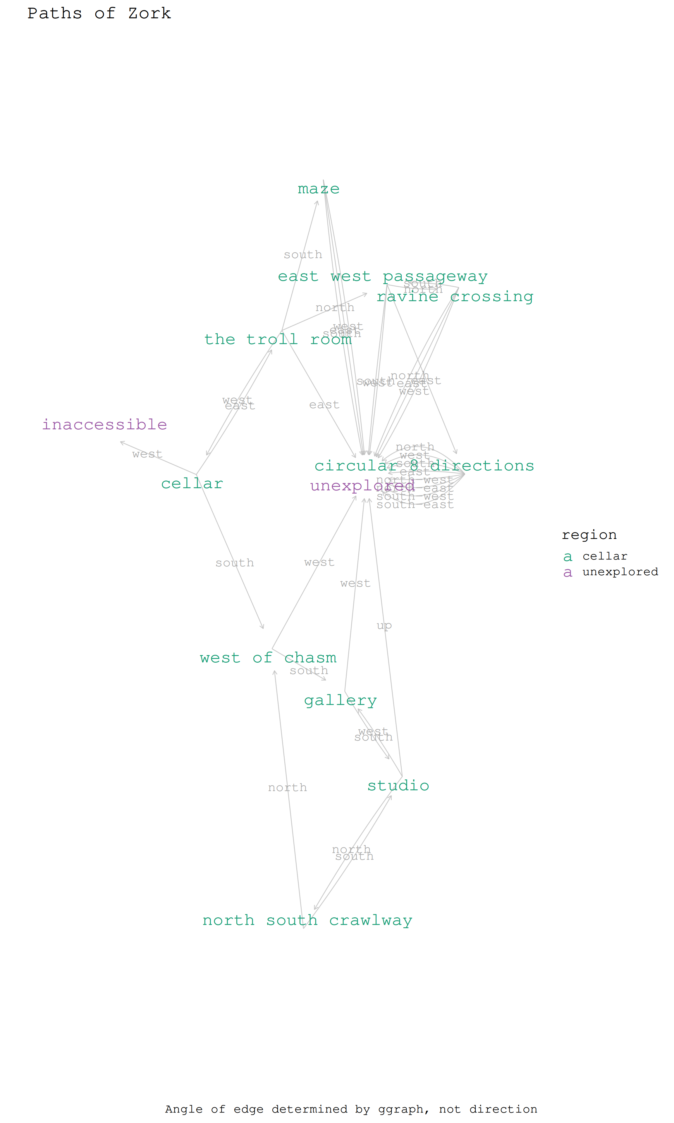 create_zork_graph <-function(zork_nodes_and_edges, selected_region ='all') { zork_nodes <- zork_nodes_and_edges$zork_nodes zork_edges <- zork_nodes_and_edges$zork_edgesif (selected_region !='all') { zork_nodes <- zork_nodes |> dplyr::filter(region %in%c(selected_region, 'unexplored')) } zork_base_graph <- zork_edges |> dplyr::mutate(from = perspective_location,to = target_location ) |># does order matter? dplyr::select(from, to, everything()) |> tidygraph::as_tbl_graph()# Join the nodes data frame to the nodes of the graph zork_graph <- zork_base_graph |> tidygraph::activate(nodes) |># add attributes to nodes dplyr::inner_join(zork_nodes, by =c("name"="perspective_location"))print(zork_graph)# report regions discoveredmessage('\n*** zork regions discovered (zork_ggraph selected_region) ***\n')print( zork_nodes |> dplyr::filter(!(region %in%c('unexplored', 'inaccessible'))) |> dplyr::pull(region) |>unique() )message('\n***\n')return(zork_graph)}